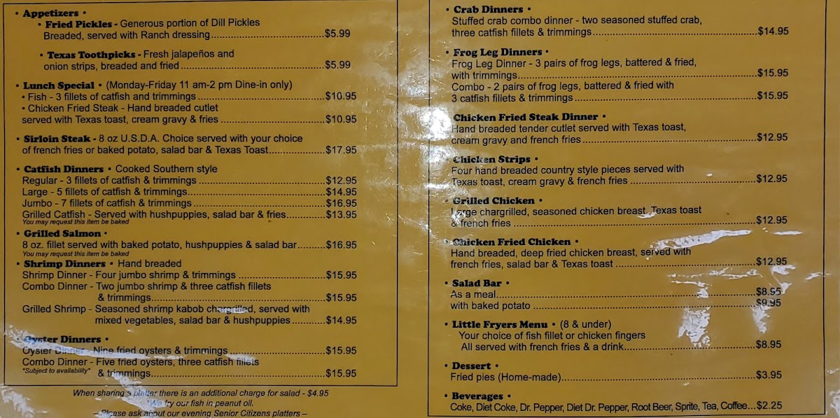 - Little Fryer's Menu: Tailored for children, this menu offers smaller servings of popular items like Chicken Strips, Catfish, and Chicken Fried Steak.