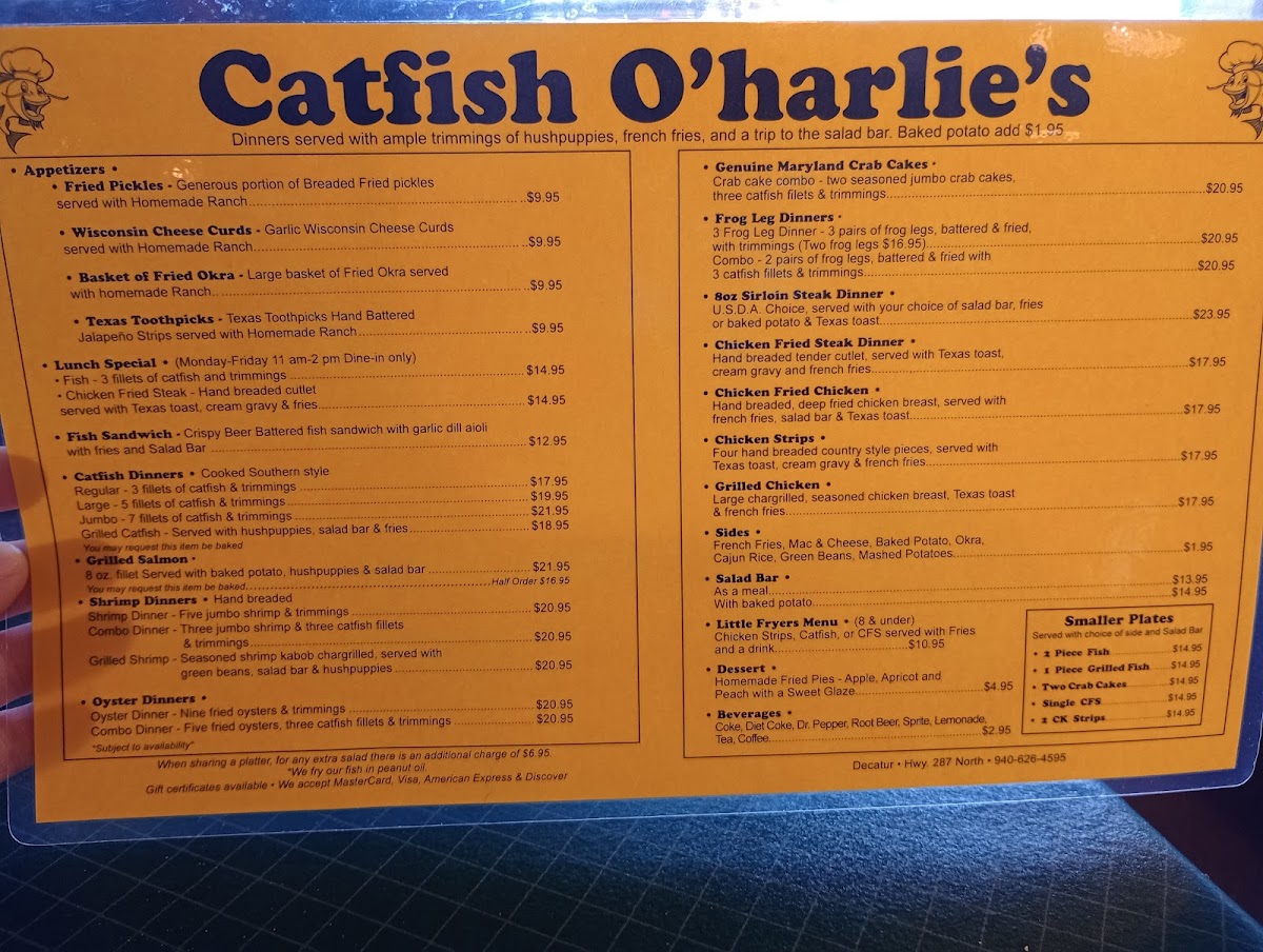 The menu at Catfish O'Harlies features a variety of seafood and Southern-style dishes, structured to accommodate different appetite sizes and preferences. It includes several categories such as Dinner Plates, Smaller Plates, and a Little Fryer's Menu, allowing guests to choose between hearty entrees and lighter meal options.